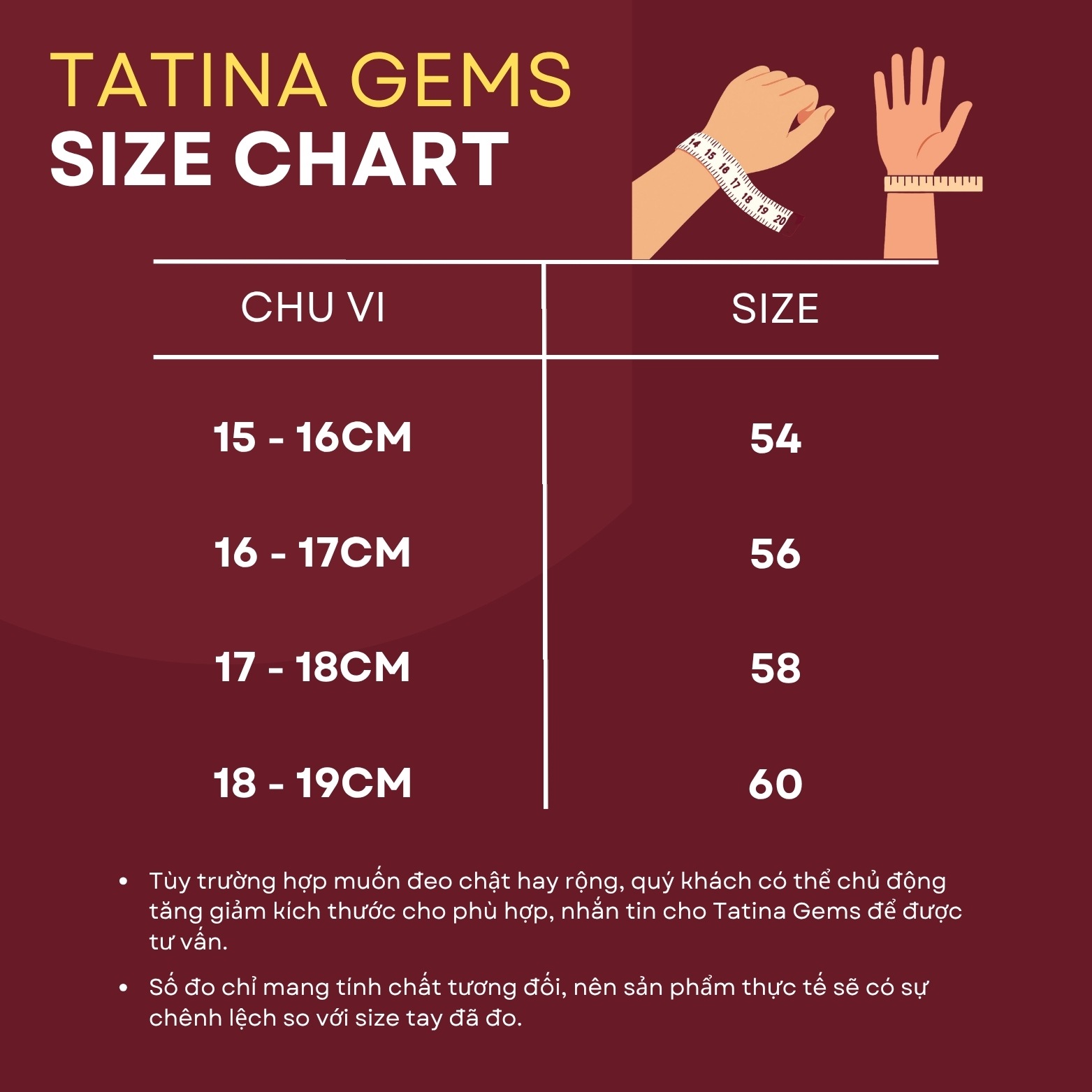- Với dải size đa dạng từ 54 - 60, bạn hãy đo chu vi phần rộng nhất của bàn tay (chỗ khớp xương) hoặc nhắn tin trực tiếp cho shop để được hỗ trợ tư vấn chọn đúng ni tay, đảm bảo chiếc vòng vừa vặn và ưng ý nhất nhé!