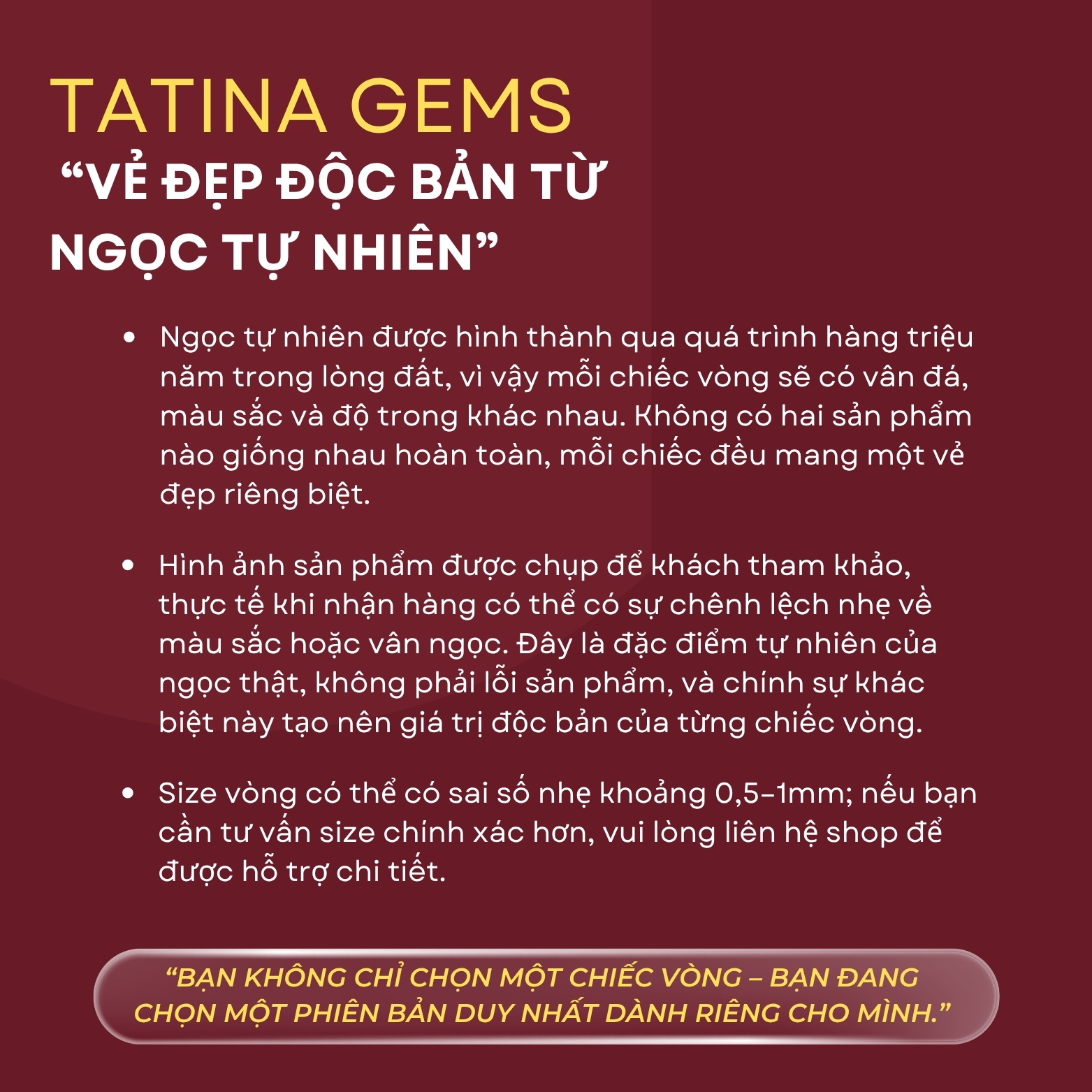 - Màu sắc: Sở hữu vân đá tự nhiên độc bản, mỗi chiếc vòng là một tác phẩm nghệ thuật duy nhất, không trùng lặp.